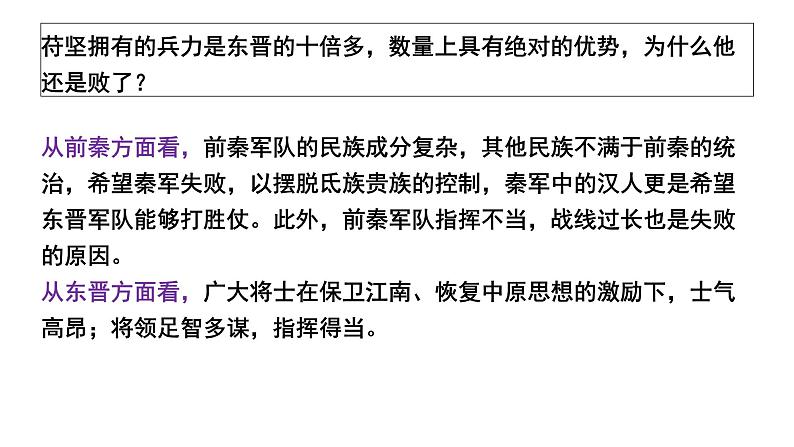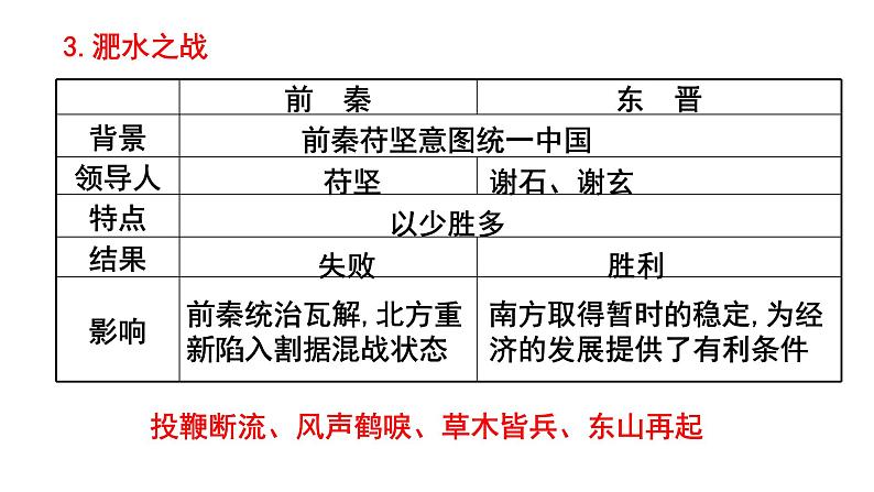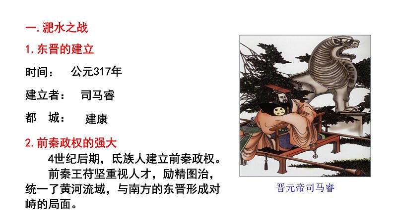 这是一份人教部编版七年级上册第四单元 三国两晋南北朝时期:政权分立与民族交融第十九课 北魏政治和北方民族大交融优秀ppt课件,共23页。PPT课件主要包含了前秦──东晋,东晋以少胜多大败前秦,淝水之战,北魏孝文帝改革,北魏政权的建立,拓跋珪,孝文帝迁都洛阳,洛阳获得发展和繁荣,①迁都洛阳,②汉化措施等内容,欢迎下载使用。