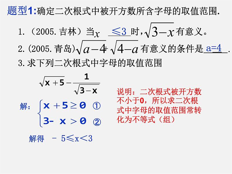 展开题型1:确定二次根式中被开方数所含字母的取值范围.