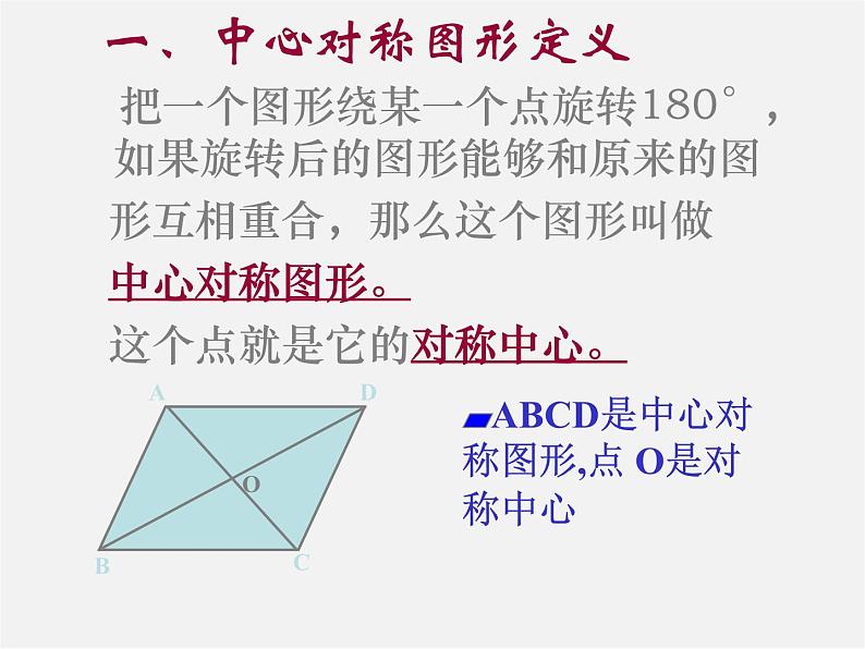 把一个图形绕着某一个点旋转180°后,如果它能够与另一个图形完全重合,那么称这两个图形关于这个点对称,也叫中心对称。这个点叫做对称中心。这两个图形中的对应点叫做关于中心的对称点。