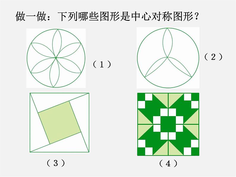 1、观察图形,并回答下面的问题:(1)哪些只是轴对称图形?(2)哪些只是中心对称图形?(3)哪些既是轴对称图形,又是中心对称图形?