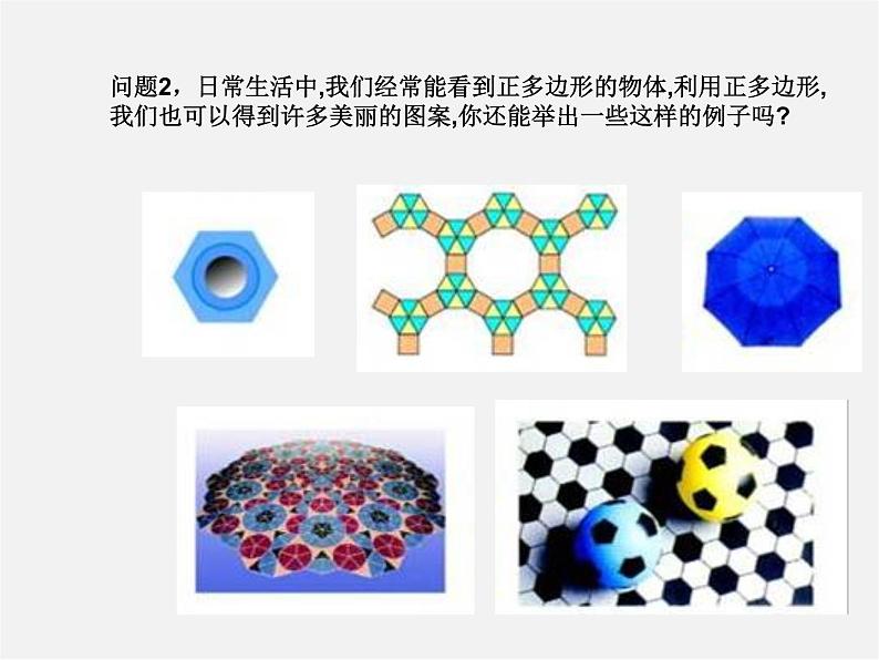问题2,日常生活中,我们经常能看到正多边形的物体,利用正多边形,我们也可以得到许多美丽的图案,你还能举出一些这样的例子吗?