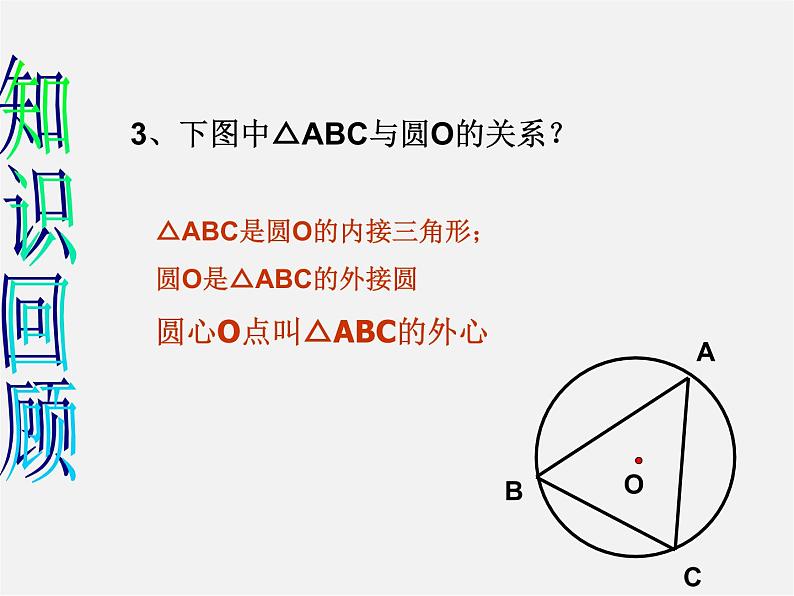 △ABC是圆O的内接三角形;圆O是△ABC的外接圆圆心O点叫△ABC的外心