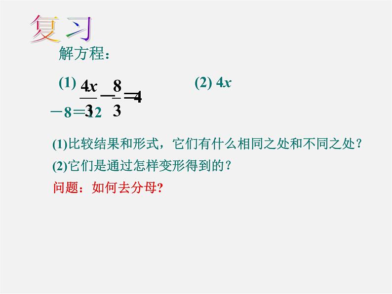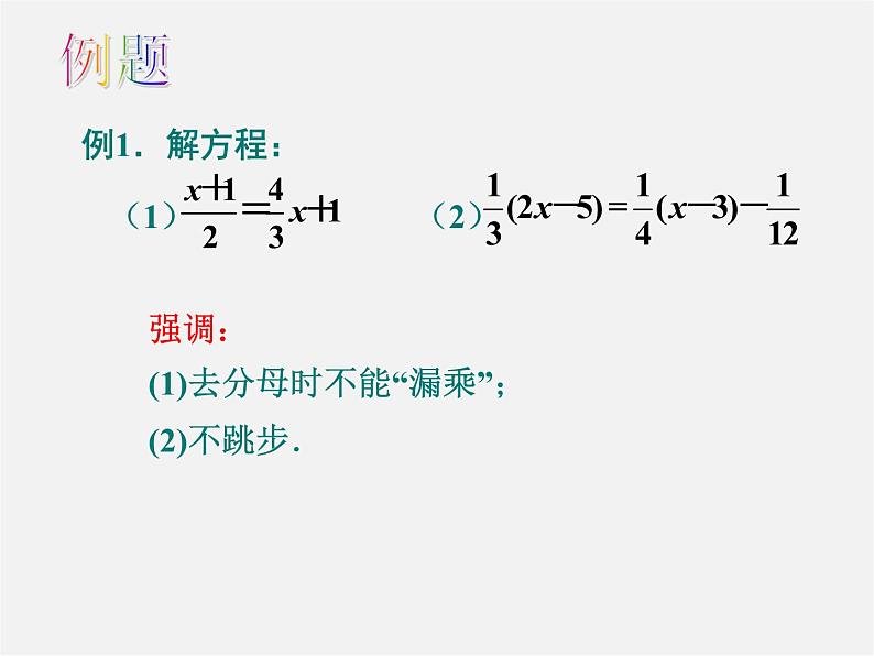 强调:(1)去分母时不能“漏乘”;(2)不跳步.