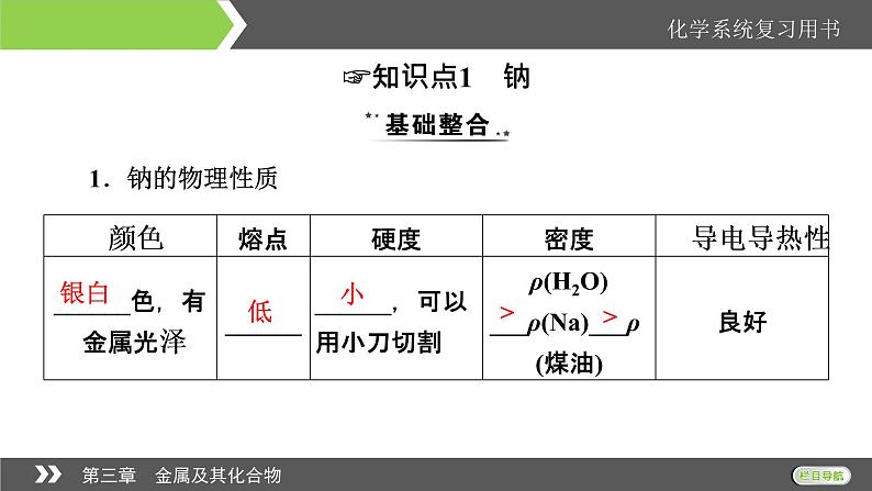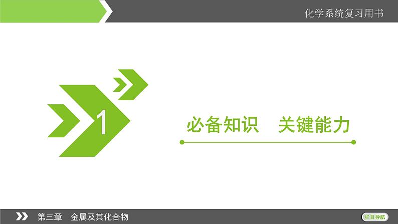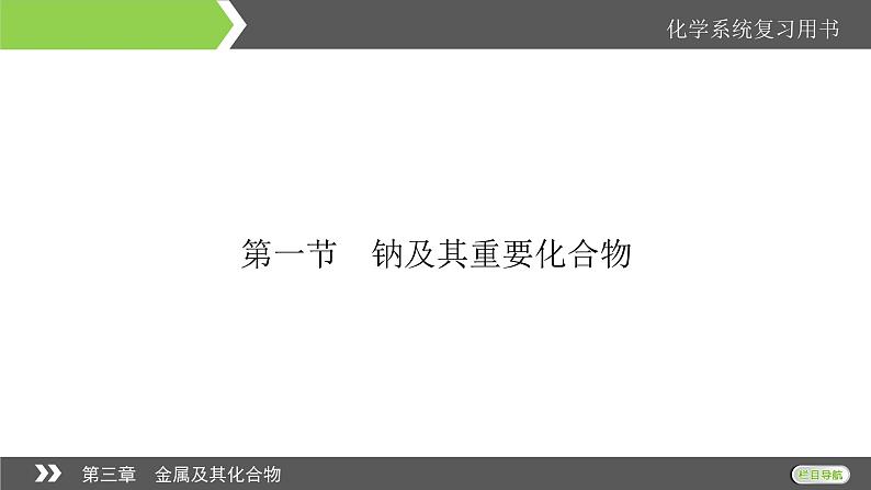 这是一份2022版高考化学一轮复习课件:第3章 第1节 钠及其重要化合物,共60页。PPT课件主要包含了栏目导航,必备知识关键能力,☞知识点1钠,NaCl+H2↑,NaOH+H2↑,石蜡油或煤油,淡黄色,加热法,通入足量CO2,稀盐酸等内容,欢迎下载使用。