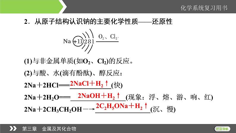 1.金属钠与溶液反应现象分析(1)钠与水、酸反应的实质都是与H+的反应。(2)钠与乙醇反应的现象特点——慢、沉。钠与乙醇反应,钠块先沉在液面下,后上下浮动、能看到表面冒出气泡,并不能熔化成小球。(3)钠与酸反应的特点——快,可能燃烧或爆炸。