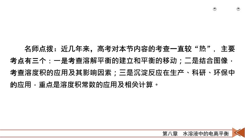 名师点拨:近几年来,高考对本节内容的考查一直较“热”,主要考点有三个:一是考查溶解平衡的建立和平衡的移动;二是结合图像,考查溶度积的应用及其影响因素;三是沉淀反应在生产、科研、环保中的应用,重点是溶度积常数的应用及相关计算。