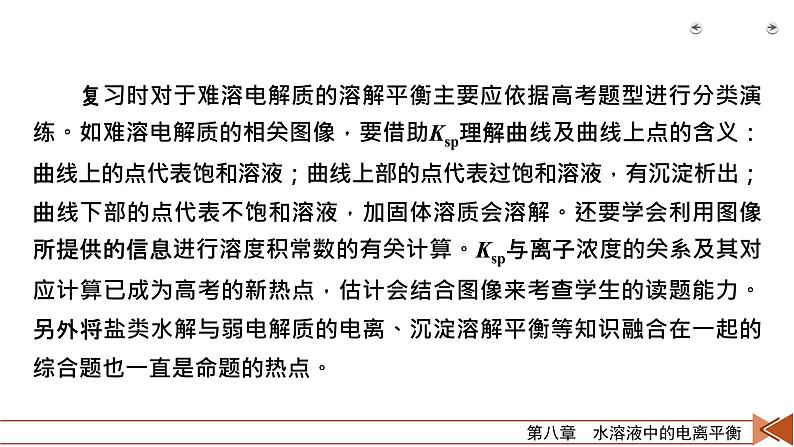 复习时对于难溶电解质的溶解平衡主要应依据高考题型进行分类演练。如难溶电解质的相关图像,要借助Ksp理解曲线及曲线上点的含义:曲线上的点代表饱和溶液;曲线上部的点代表过饱和溶液,有沉淀析出;曲线下部的点代表不饱和溶液,加固体溶质会溶解。还要学会利用图像所提供的信息进行溶度积常数的有关计算。Ksp与离子浓度的关系及其对应计算已成为高考的新热点,估计会结合图像来考查学生的读题能力。另外将盐类水解与弱电解质的电离、沉淀溶解平衡等知识融合在一起的综合题也一直是命题的热点。