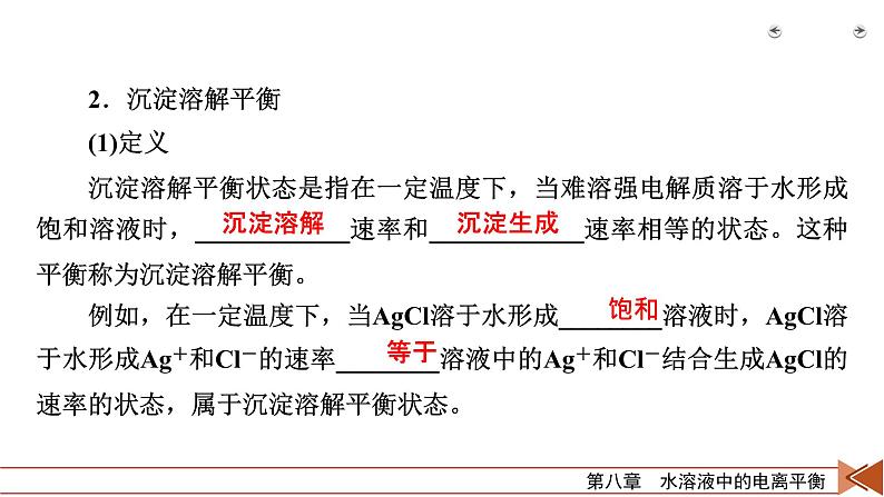 2.沉淀溶解平衡(1)定义沉淀溶解平衡状态是指在一定温度下,当难溶强电解质溶于水形成饱和溶液时,____________速率和____________速率相等的状态。这种平衡称为沉淀溶解平衡。例如,在一定温度下,当AgCl溶于水形成________溶液时,AgCl溶于水形成Ag+和Cl-的速率________溶液中的Ag+和Cl-结合生成AgCl的速率的状态,属于沉淀溶解平衡状态。