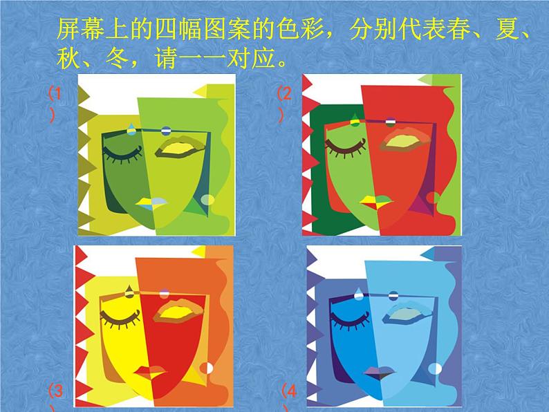 老师:色彩是我们认识世界的基本方式之一,色彩有冷暖,有脾气。医生可以通过病人的脸色,判断患者的病情;果农可以通过水果的颜色判断成熟度;气象学家可以通过云朵的形状和颜色,判断大致的天气……。今天我们来做个小游戏(播放图片),老师这儿有四幅图片,分别代表的是春、夏、秋、冬,同学们对照图片将它们一一对号。