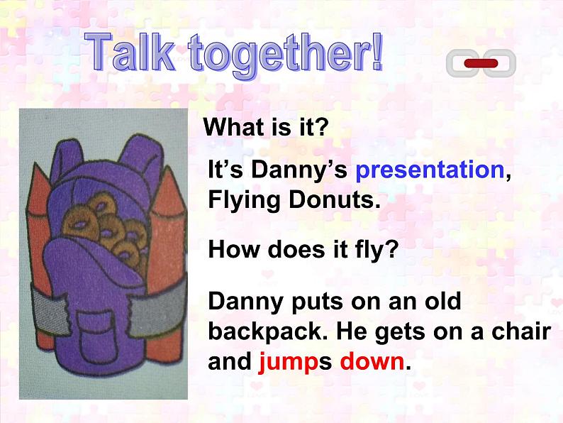 present v. 呈现 present …t … 把 …… 呈现给…… presentatin n. 介绍,陈述 jump dwn 跳下