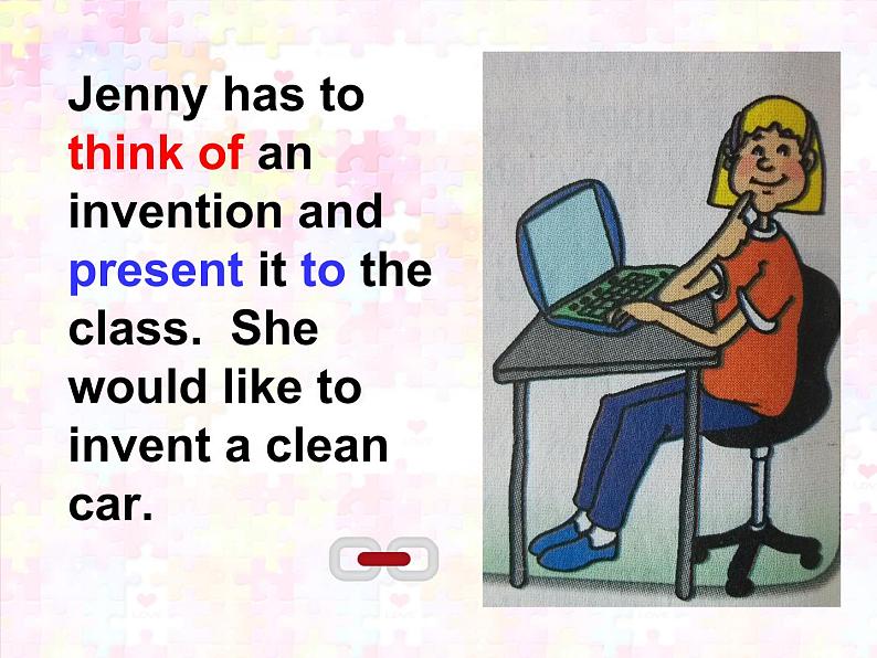 Jenny has t think f an inventin and present it t the class. She wuld like t invent a clean car.