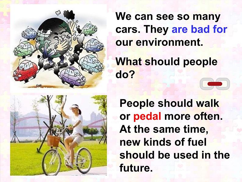 Peple shuld walk r pedal mre ften. At the same time, new kinds f fuel shuld be used in the future.