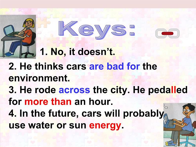 2. He thinks cars are bad fr the envirnment.3. He rde acrss the city. He pedalled fr mre than an hur. 4. In the future, cars will prbably use water r sun energy.