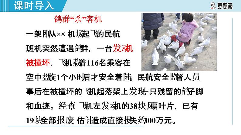 鸽群“杀”客机一架刚从×× 机场起飞的民航班机突然遭遇鸽群,一台发动机被撞坏,飞机载着116名乘客在空中盘旋1个小时后才安全着陆。民航安全监督人员事后在被撞坏的飞机起落架上发现一只残留的鸽子脚和血迹。经查,飞机左发动机的38块风扇叶片,已有19块全部报废,估计造成直接损失约300万元。