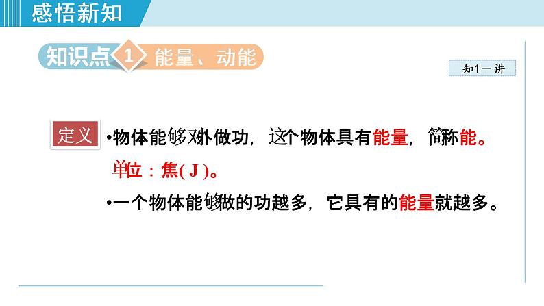 物体能够对外做功,这个物体具有能量,简称能。 单位:焦( J )。一个物体能够做的功越多,它具有的能量就越多。