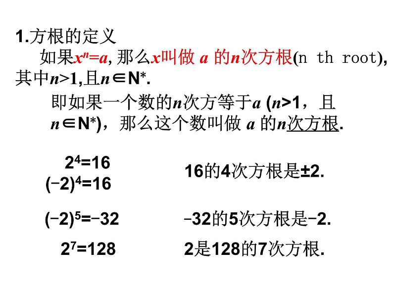 1.方根的定义 如果xn=a,那么x叫做 a 的n次方根(n th rt), 其中n>1,且n∈N*.