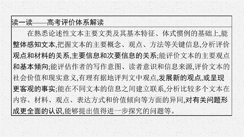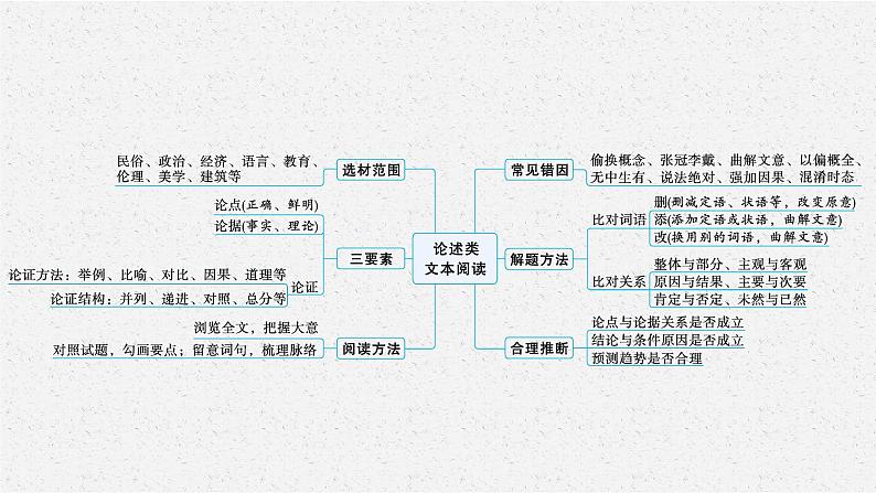 这是一份2023届高考语文复习:论述类文本阅读 课件,共28页。PPT课件主要包含了论述类文本的阅读技巧,错误选项的命题陷阱,四偷换概念,五曲解文意,六张冠李戴,七无中生有,八关系混乱,实战演练等内容,欢迎下载使用。