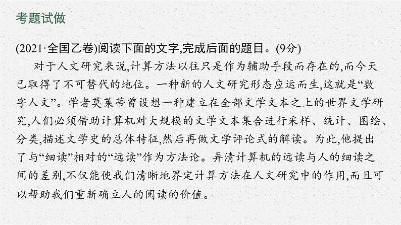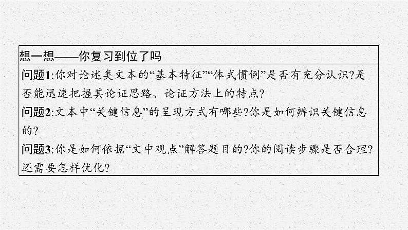 这是一份高考论述类文本阅读复习课件PPT,共15页。PPT课件主要包含了知识点回忆,选择题做题思路,常考的论证方法等内容,欢迎下载使用。