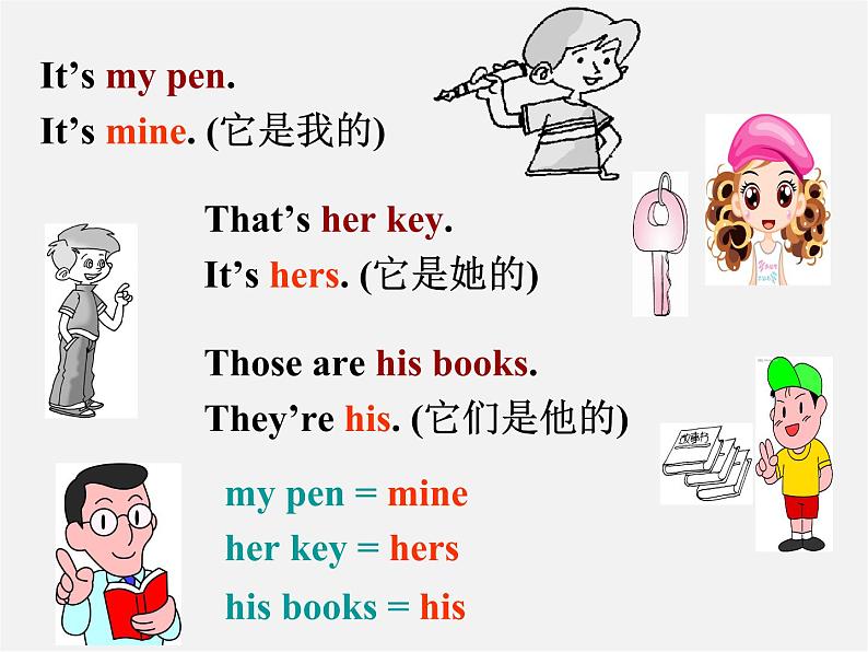 Anna: It’s Helen’s. And the green pen is hers, t.Teacher: And the eraser? Is that yurs?Anna: Yes, it is.Teacher: Thank yu fr yur help, Anna.Anna: Yu’re welcme.