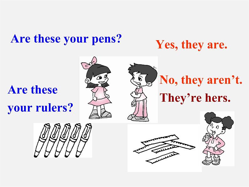 2. Are these/thse …? 这些/那些是……吗? 在这种句型中名词要用复数形式。不用不可数名词。 肯定回答:Yes, they are. 是的。 否定回答:N, they aren’t. 不是。 注意:不能用these或thse来做简略回答。 Are these yur rulers? 这些是你的尺子吗? N, they aren’t. 不是。 Are thse his erasers? 那些是他的橡皮吗? Yes, they are. 是。