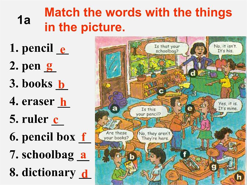 Teacher: Hi, Anna. Are these yur pencils?Anna: N, they’re Bb’s.Teacher: And is this his green pen? Anna: N, it isn’t. The blue pen is his.Teacher: What abut this dictinary?