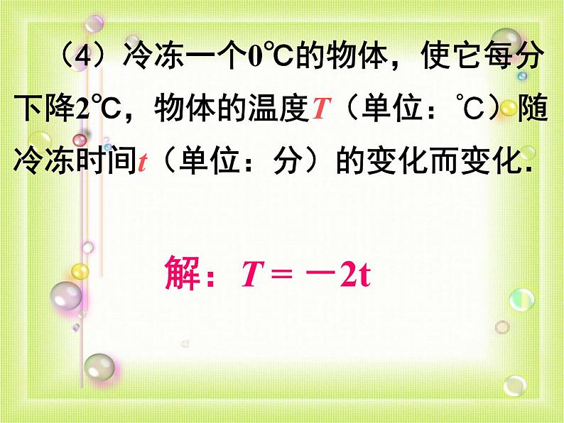 (4)冷冻一个0℃的物体,使它每分下降2℃,物体的温度T(单位:℃)随冷冻时间t(单位:分)的变化而变化.