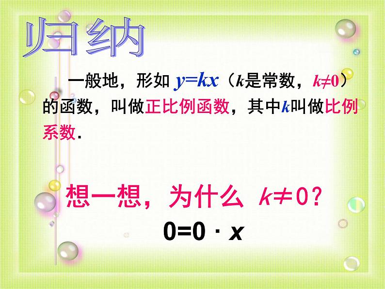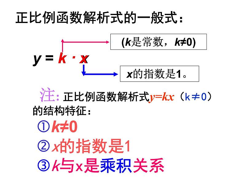 注: 正比例函数解析式y=kx(k≠0)的结构特征:k≠0 x的指数是1k与x是乘积关系