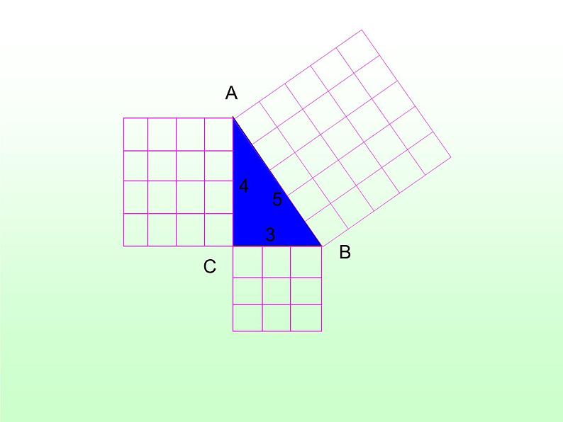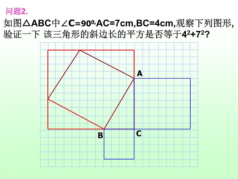 如图△ABC中∠C=900,AC=7cm,BC=4cm,观察下列图形,验证一下 该三角形的斜边长的平方是否等于42+72?