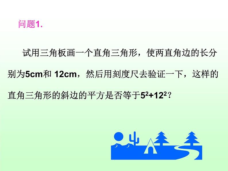 试用三角板画一个直角三角形,使两直角边的长分别为5cm和 12cm,然后用刻度尺去验证一下,这样的直角三角形的斜边的平方是否等于52+122?