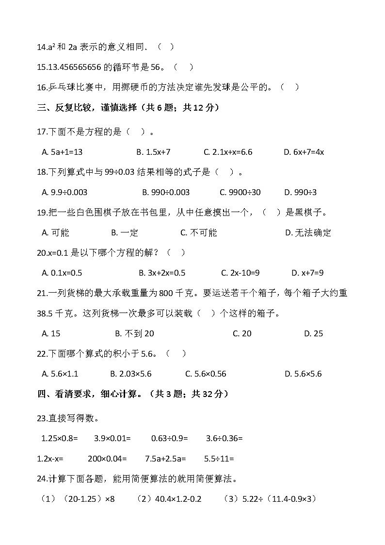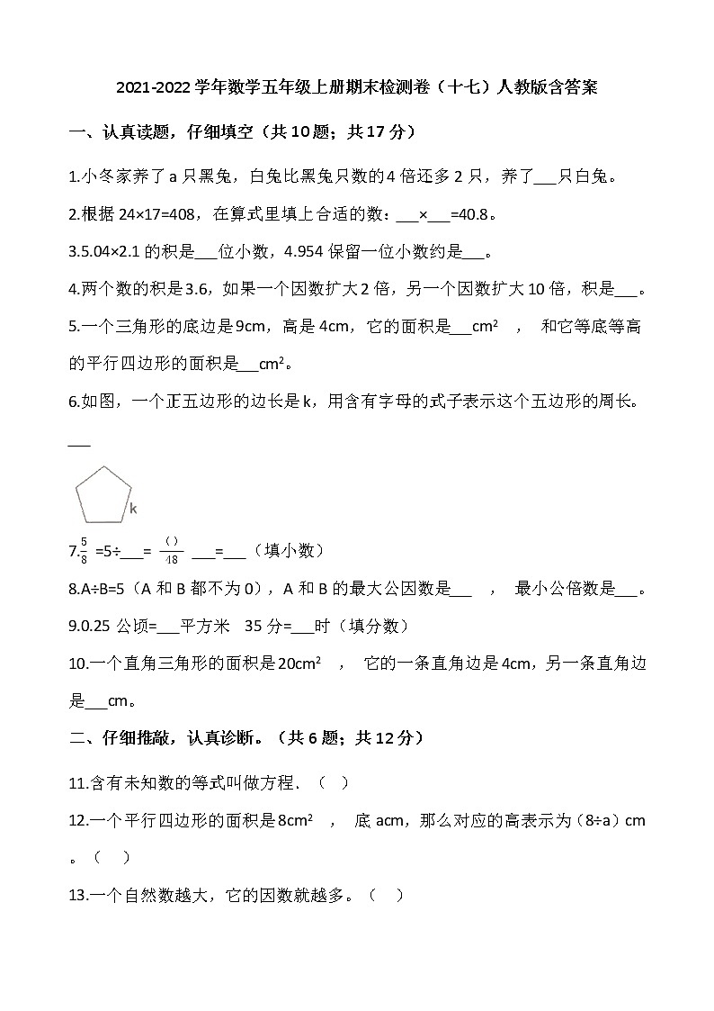 展开这是一份2021-2022学年数学五年级上册期末检测卷(十七)人教版含答案,共9页。试卷主要包含了认真读题,仔细填空,仔细推敲,认真诊断,反复比较,谨慎选择,看清要求,细心计算,操作题,活用知识,解决问题等内容,欢迎下载使用。