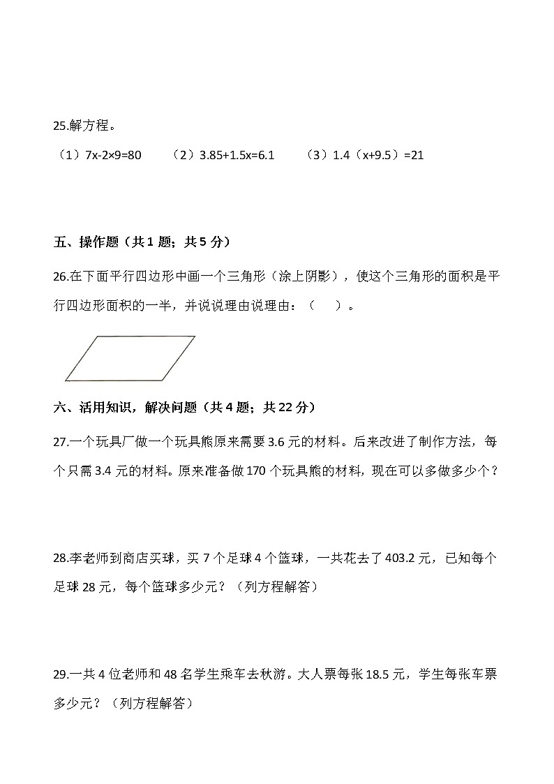 26.在下面平行四边形中画一个三角形(涂上阴影),使这个三角形的面积是平行四边形面积的一半,并说说理由说理由:( )。