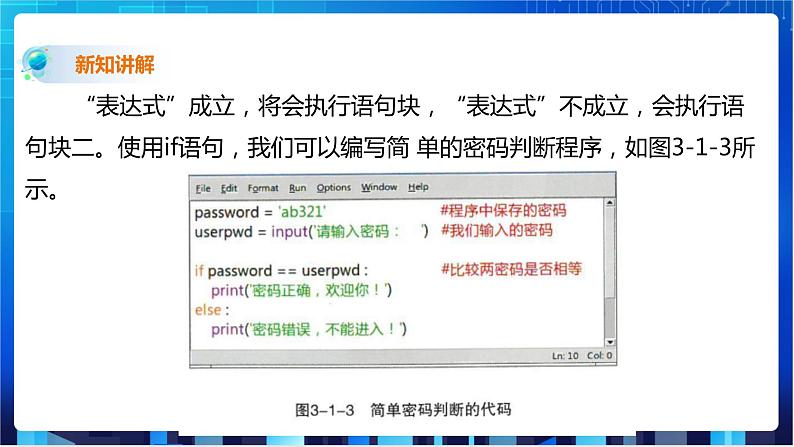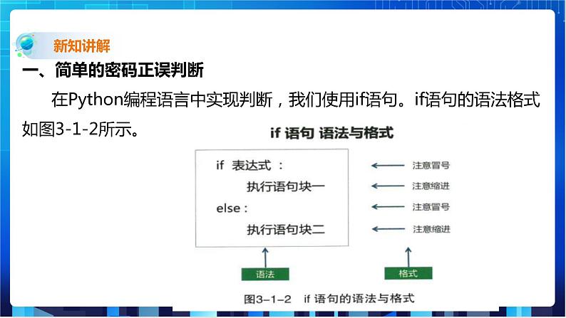 一、简单的密码正误判断 在Pythn编程语言中实现判断,我们使用if语句。if语句的语法格式如图3-1-2所示。