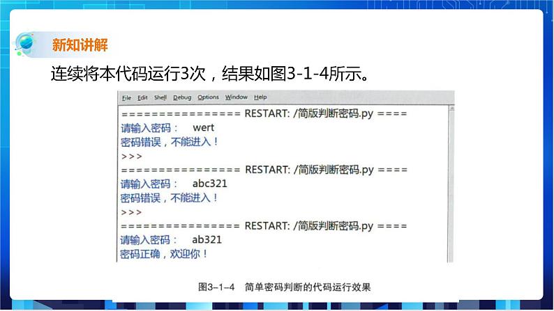 在如图3-1-6所示的代码中,输人错误时程序没有“密码错误”的提示,你能将“密码错误”的提示加入到代码中去吗?先动手试试,再谈谈自己尝试之后有什么发现。