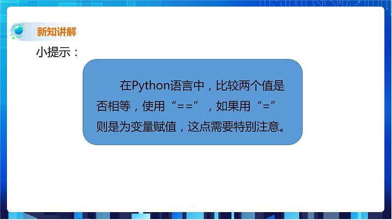在Pythn语言中,比较两个值是否相等,使用“==”,如果用“=”则是为变量赋值,这点需要特别注意。