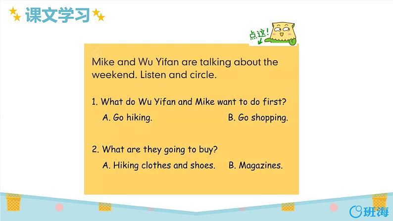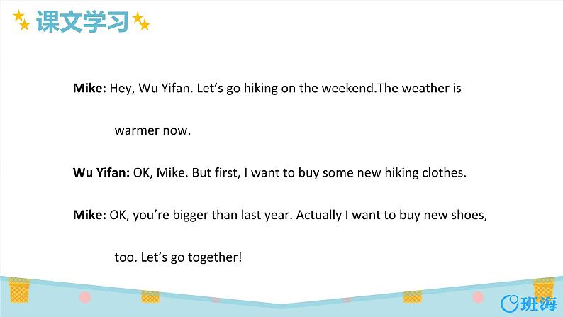 展开Mike: Hey, Wu Yifan. Let’s g hiking n the weekend.The weather is warmer nw.Wu Yifan: OK, Mike. But first, I want t buy sme new hiking clthes. Mike: OK, yu’re bigger than last year. Actually I want t buy new shes, t. Let’s g tgether!