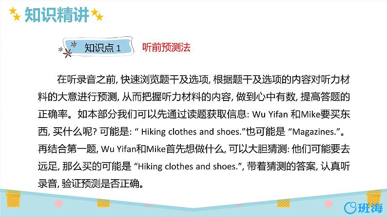 在听录音之前, 快速浏览题干及选项, 根据题干及选项的内容对听力材料的大意进行预测, 从而把握听力材料的内容, 做到心中有数, 提高答题的正确率。如本部分我们可以先通过读题获取信息: Wu Yifan 和Mike要买东西, 买什么呢? 可能是: “ Hiking clthes and shes.”也可能是 “Magazines.”。再结合第一题, Wu Yifan和Mike首先想做什么, 可以大胆猜测: 他们可能要去远足, 那么买的可能是 “Hiking clthes and shes.”, 带着猜测的答案, 认真听录音, 验证预测是否正确。