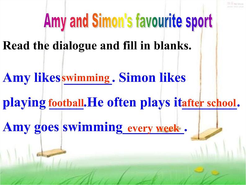Amy: I like swimming. What’s yur favurite sprt, Simn?Simn: I like playing ftball.Amy: D yu ften play ftball?Simn: Yes. I ften play ftball after schl. What abut yu?Amy: I g swimming every week.