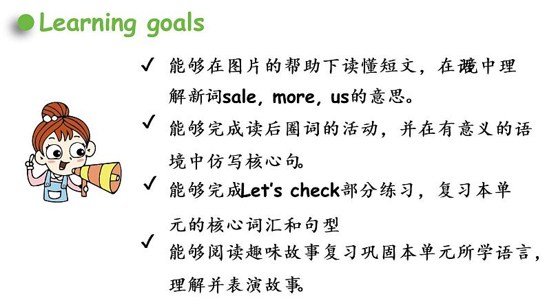 PEP版英语四年级(下)Unit 6 ShoppingPart B Read and write & Let‘s check & Let’s sing & Part C Story timeLearning goals能够在图片的帮助下读懂短文,在语境中理解新词sale, more, us的意思。✔ 能够完成读后圈词的活动,并在有意义的语境中仿写核心句。✔ 能够完成Let’s check部分练习,复习本单元的核心词汇和句型✔ 能够阅读趣味故事复习巩固本单元所学语言,理解并表演故事。✔ Let’s playWarming up pretty 美观的;精致的 of course 当然 expensive昂贵的;花钱多的 nice 好的 cheap花钱少的;便宜的 try on 试穿 scarf 围巾;披巾 umbrella 雨伞 size 尺码;号 too 太;过于 how much 多少钱 sunglasses 眼镜PresentationRead and answer 1. How much is the red scarf? It’s _______ yuan. 2.How much are the brown gloves? They’re_______ yuan. 3. Is the umbrella too expensive? ________________4.Are the sunglasses cheap? ________________Read and circleComplete the chartScarf5niceumbrella5cheap Let’s answer1. How much is the red scarf? It’s _______ yuan. 2.How much are the brown gloves? They’re_______ yuan. 3. Is the umbrella too expensive? ________________4.Are the sunglasses cheap? ________________fivefiveNo, it isn’t.Yes, they are. Listen and imitate Look and sayWhat are these?They are sunglasses.How much are they?They are 500 yuan.Oh! They are very expensive. What are these?They are gloves.Are they big or small?They are small.Yes. They are too small.Look and writeDraw your shoes and write a sentence.very 和 too都可以表示“很、非常”,且位于在句中。They are very/too…Look and sayWhat can you see in the picture?I can see …Listen and tick(√) or cross(×)✔✘✘✔Listen again and check the answers.Listen and read1. Man: Can I help you? John’s mum: Yes, please. Can I try on these sunglasses? Man: OK. Here you are.2. Sarah: How much is this pretty scarf? Woman: It’s 20 yuan. Sarah: Oh, that’s very cheap!3. Jim’s dad: Are they OK? Jim: No. My feet hurt. They’re too small.4. Amy’s dad: How much are these gloves? Woman: They’re 25 yuan. Amy: Can I try them on, please? Woman: Sure.cheap sunglassesa pretty green scarfexpensive glovesmy friend’s umbrellaLook and match Let’s sing Look and say1.Who is he?He is Mr Elephant.He has a clothes shop.2.What’s in his shop?Dresses/…Zoom, do a good job. What does Zoom do?He is a shop assistant.Watch and sayZoom, do a good job.No problem! Here is Miss Sheep. What does she like?She likes the skirt.Watch and sayCan I help you?Yes. Can I see that skirt, please?Look and sayHow does she like the skirt?It’s pretty.It’s pretty, isn’t it?Yes, it’s nice. How much is the skirt?A. It’s $16.B. It’s $91.Look and sayWatch and sayAccording to Zoom, how much is the skirt?It’s $91.It’s cheap, too. Sixteen dollars!No, it isn’t.Then how much is it?It’s nine-one.Sorry, Miss. Mr Elephant is angry. What will he say to Zoom?Zoom, you’re fired!Watch and sayZoom,you’re fired!But... Look, listen and act Can I help you?Yes. Can I see that skirt, please?Zoom, do a good job.No problem!好好工作没问题It’s cheap, too. Sixteen dollars!No, it isn’t.It’s pretty, isn’t it?Yes, it’s nice.Then how much is it?It’s nine-one.Sorry, Miss.Zoom,you’re fired!But...解雇 Read and order123456 Let’s talk1. If you are Zoom, what will you do?A. Apologize. B. Ask for one more chance.C. Work carefully.2. If you are Miss Sheep, what will you say?A. No problem. I’ll take it.B. I’m sorry. Bye.C. Be careful. Zoom.What do you want to say to Zoom?What can you learn from this story?Let’s thinkWork carefully! Group workNow Zip is the shop assistant. Make a new dialogue.Zip:__________________Miss Sheep:_______Zip:__________________Miss Sheep:_______Zip:__________________Miss Sheep:_______重点单词或词组skirt短裙pretty美观的dollars 美元fired解雇Summary重点句型—Can I help you/see that skirt? —Yes. / No.2. —How much is it? —It is ninety-one.3. You’re fired!0102Homework Listen and read “Story time”. Share “Story time” with your friends.