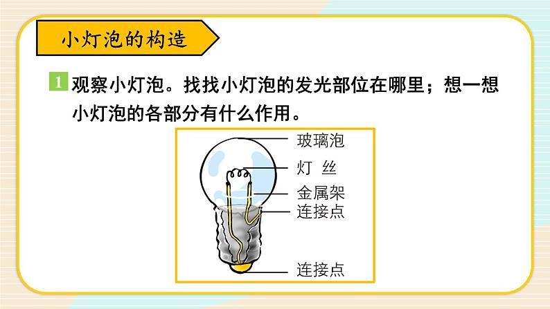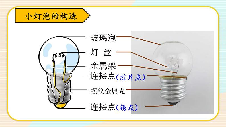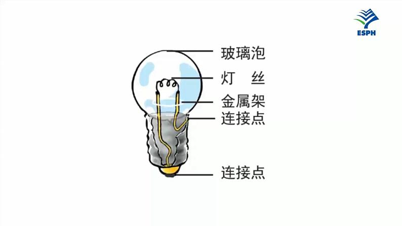 展开点亮小灯泡教科版四年级下册灯 泡怎样让它亮起来?灯泡为什么会选用钨丝制作?钨丝是怎么放入灯泡中的?家庭电路中使用灯泡(220V)实验室小灯泡(2.5V和3.8V)小灯泡的构造观察小灯泡。找找小灯泡的发光部位在哪里;想一想小灯泡的各部分有什么作用。1小灯泡的构造小灯泡的构造(锡点)(芯片点)螺纹金属壳让小灯泡发光 打开手电筒的开关,小灯泡就亮了,它是怎样亮起来的? 如果有导线和电池,你能让让小灯泡亮起来吗?让小灯泡发光电 池提供电流来源的器件叫电池。(一次性)(可充电)电 流电流向水流一样,有一个方向,电流从正极流向负极。+_导 线绝缘外皮安全提示用一段导线和一节电池让小灯泡亮起来。让小灯泡发光2 观察下面四幅连接图,哪些能够点亮小灯泡,哪些不能点亮的小灯泡。先猜想后验证。让小灯泡发光 导线连接小灯泡的锡粒与电池底部的锌壳,电池铜帽与小灯泡螺纹接触小灯泡亮了让小灯泡发光 导线连接电池的铜帽与底部的锌壳,小灯泡锡粒与电池铜帽接触小灯泡不亮让小灯泡发光 导线连接小灯泡螺纹与电池底部的锌壳,小灯泡锡粒与电池铜帽接触。小灯泡亮了让小灯泡发光 导线连接小灯泡螺纹与电池旁的外壳,小灯泡的锡粒接触电池铜帽。小灯泡不亮让小灯泡发光通路通路(闭合回路)(闭合回路)让小灯泡发光通路短路通路断路(闭合回路)(闭合回路)VS断路与短路的相同点与不同点:不同点1:短路是指正负极直接相连形成一个回路,有电流通过。断路是指正负极线路断开,没有电流通过。不同点2:短路将致使系统烧毁,而断路只是造成系统的暂时无法使用。记录有哪些连接能点亮小灯泡,哪些连接不能点亮小灯泡。小灯泡的连接方法记录表让小灯泡发光2小灯泡亮短路小灯泡亮断路只有电流从电池的正极流向负极,通过灯丝形成完整的闭合回路的时候,小灯泡才能发光。电流流动的路径+-电流流动的路径1.展示我们的实验记录,交流哪些连接能点亮小灯泡,哪些不能点亮小灯泡。2.分析那些能点亮小灯泡的连接,你认为电池盒小灯泡怎样连接,小灯泡才能亮起来。3.你认为小灯泡是如何亮起来的?小灯泡的连接方法记录表闭合回路短路(小灯泡亮)断路只有电流从电池的正极流向负极,通过灯丝形成完整的闭合回路的时候,小灯泡才能发光。(小灯泡亮)闭合回路课堂小结课后作业二、判断题。1.只要把小灯泡和电池连接在一起,就能点亮小灯泡。( )2.小灯泡发光的地方是灯丝,不是玻璃泡。 ( )3.电池一定要正极朝上,才能点亮小灯泡。 ( )4.小灯泡的金属架断开了,也不会影响小灯泡发光。 ( )5.一个完整的电路只能用一种方式连接。 ( )×√×××三.选择题。2.下图中电池正、负极标注正确的是( )。ABCA3.下列关于短路的说法正确的是( )。A.短路时会损坏电池B.短路时电池不会发烫C.短路时小灯泡会更亮A4.下列连接图中,( )不能点亮小灯泡。ABCB