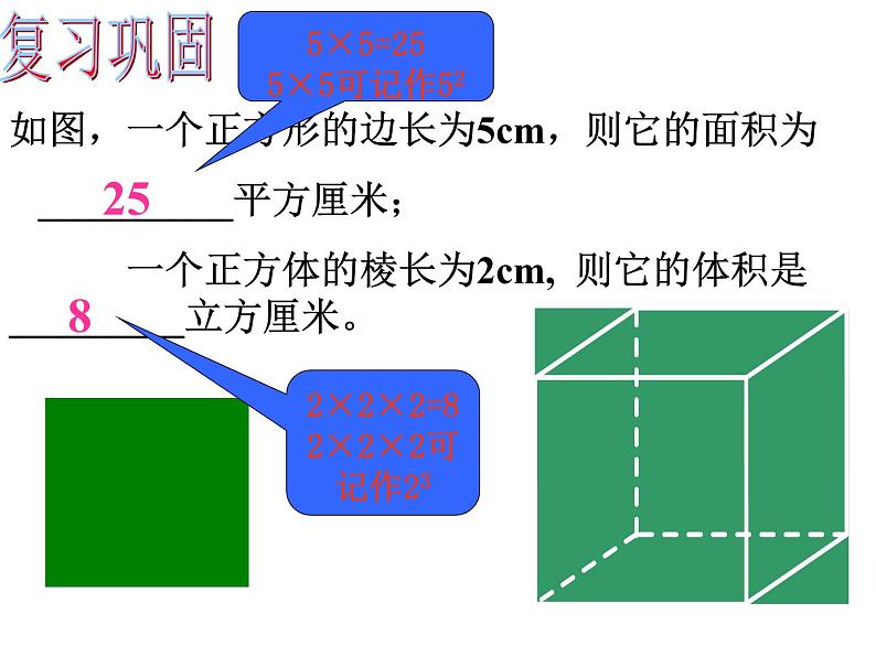 展开如图,一个正方形的边长为5cm,则它的面积为 __________平方厘米; 一个正方体的棱长为2cm, 则它的体积是_________立方厘米。
