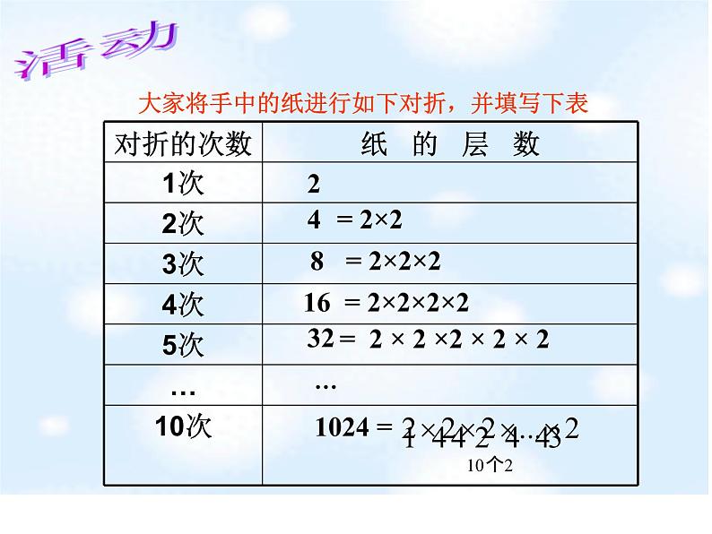 沪科版七年级上册1.6 有理数的乘方示范课课件ppt: 这是一份沪科版七年级上册1.6 有理数的乘方示范课课件ppt,共12页。PPT课件主要包含了动动手动动脑,对折次数,对折后纸的层数,×2×2,×2×2×2,那么类似地,×2×2×2×2,•••,×2ו••×2,n个2等内容,欢迎下载使用。