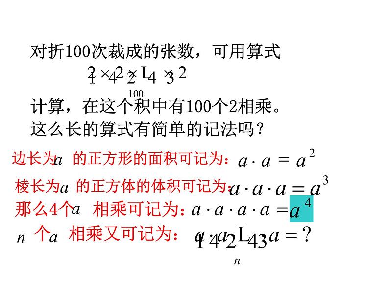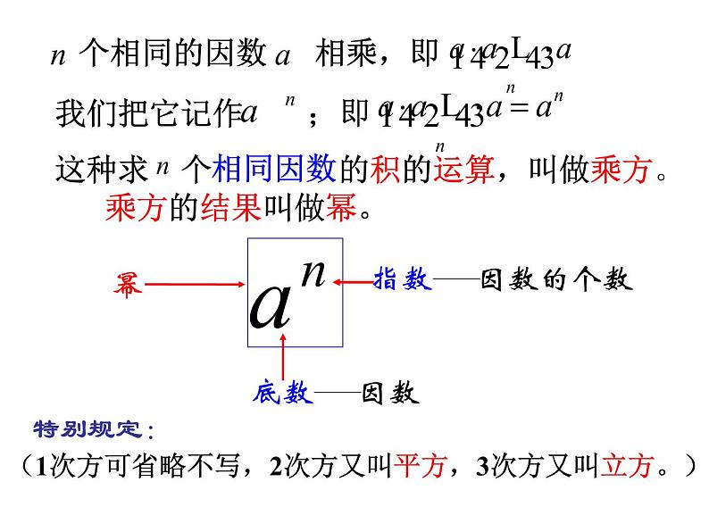 (1次方可省略不写,2次方又叫平方,3次方又叫立方。)