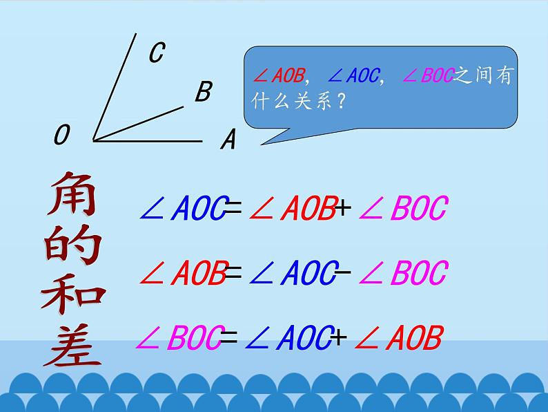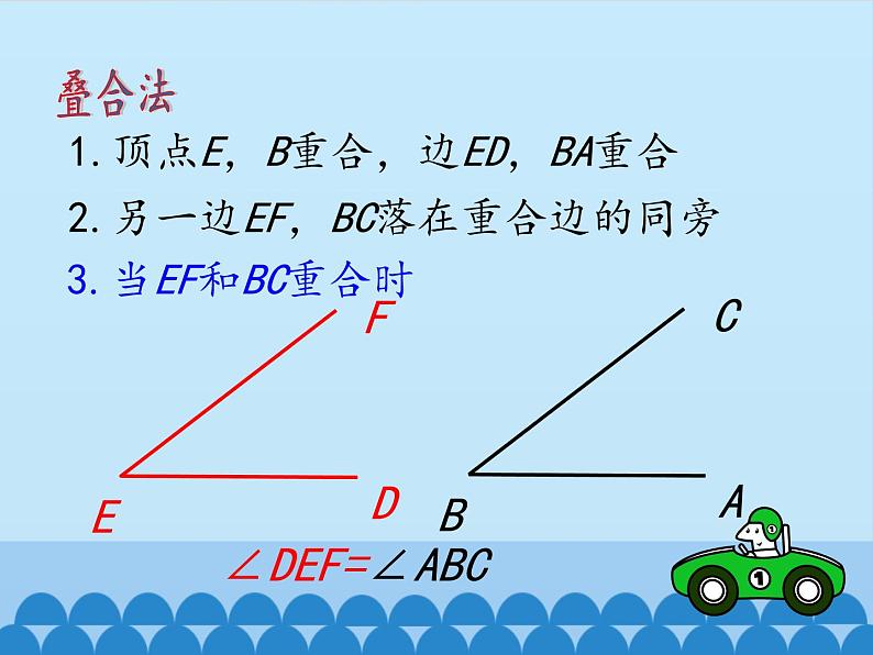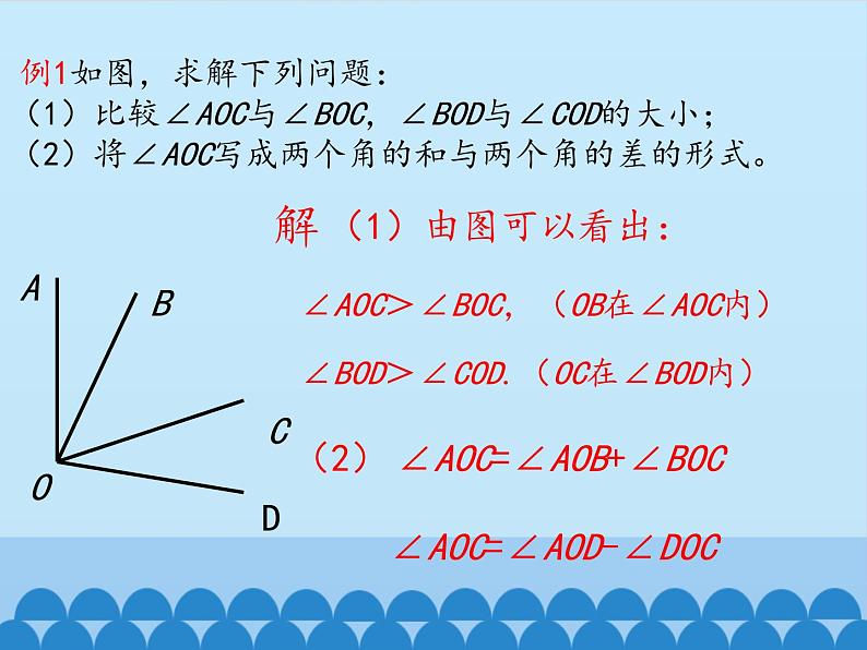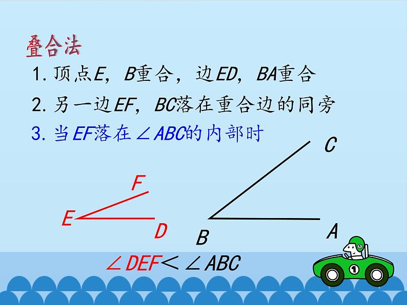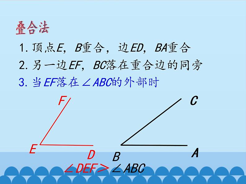 角的比较与补(余)角你还记得怎么样比较两条线段的长短吗?1.度量法2.叠合法怎样比较两个角的大小呢??度量法1.角的顶点与量角器的中心重合2.角的一边与量角器的零线重合3.读出角的另一边所对的度数∵70°>30°∴∠ABC>∠DEFDEFCBA70°30°叠合法1.顶点E,B重合,边ED,BA重合2.另一边EF,BC落在重合边的同旁3.当EF落在∠ABC的外部时∠DEF>∠ABCAC1.顶点E,B重合,边ED,BA重合2.另一边EF,BC落在重合边的同旁3.当EF落在∠ABC的内部时∠DEF<∠ABC叠合法1.顶点E,B重合,边ED,BA重合2.另一边EF,BC落在重合边的同旁3.当EF和BC重合时∠DEF=∠ABC叠合法角的和差∠AOC=∠AOB+∠BOC∠AOB=∠AOC-∠BOC∠BOC=∠AOC+∠AOB例1如图,求解下列问题:(1)比较∠AOC与∠BOC,∠BOD与∠COD的大小;(2)将∠AOC写成两个角的和与两个角的差的形式。解(1)由图可以看出:∠AOC>∠BOC,(OB在∠AOC内)∠BOD>∠COD.(OC在∠BOD内)(2)∠AOC=∠AOB+∠BOC∠AOC=∠AOD-∠DOC思考:当∠AOB=2∠AOC时,∠AOC与∠BOC有怎样的数量关系? 在角的内部,以角的顶点为端点的一条射线把这个角分成两个相等的角,这条射线叫做这个角的平分线。∵射线OC平分∠AOB或∠AOB=2∠AOC=2∠BOC 如图,点A,O在同一条直线上,则∠AOC与∠BOC有怎样的关系?∠AOC+∠BOC=180°你还能举出一些具有这样关系的角吗?若∠1=40°,∠2=140°,则∠1+∠2=180°若∠α=65°,∠β=115°,则∠α+∠β=180°…… 如果两个角的和等于一个平角(180°),那么我们就称这两个角互为补角,简称互补。平角如图,∠1+∠2=180°,∠1叫做∠2的补角,∠2也叫做∠1的补角,∠1与∠2互补。 如图,∠AOB是直角,则∠AOC与∠BOC有怎样的关系?∠AOC+∠BOC=90°你还能举出一些具有这样关系的角吗?若∠1=30°,∠2=60°,则∠1+∠2=90°若∠α=25°,∠β=65°,则∠α+∠β=90°…… 如果两个角的和等于一个直角(90°),那么我们就称这两个角互为余角,简称互余。直角如图∠α+∠β=90°,∠α叫做∠β的余角,∠β也叫做∠α的余角,∠α与∠β互余。 (1)动手画一画:已知,如图,∠α,请利用三角板画∠α的补角。 图中∠α的补角∠1,∠2的大小有什么关系?为什么?∵∠1=180°-∠α ∠2=180°-∠α∴∠1=∠2这一结论用文字怎么叙述?同角的补角相等12图中∠α的补角为∠1,∠2。∵∠1=180°-∠α ∠2=180°-∠β∴∠1=∠2这一结论用文字又怎么叙述?等角的补角相等 如图,∠α=∠β,∠α的补角∠1,∠β的补角∠2的大小有什么关系?为什么?又∵∠α=∠β (1)动手画一画:已知,如图,∠α,请利用三角板画∠α的余角。 图中∠α的余角∠1,∠2的大小有什么关系?为什么?∵∠1=90°-∠α ∠2=90°-∠α∴∠1=∠2这一结论用文字又怎么叙述?同角的余角相等12图中∠α的余角为∠1,∠2。∵∠1=90°-∠α ∠2=90°-∠β∴∠1=∠2 这一结论用文字又怎么叙述?等角的余角相等 如图,∠α=∠β,∠α的余角∠1,∠β的余角∠2的大小有什么关系?为什么?又∵∠α=∠β1.角的大小比较方法2.角的和差3.三角板可拼出的角4.角的平分线5.补角和余角及其性质谢 谢