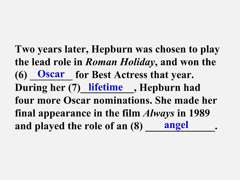 Tw years later, Hepburn was chsen t play the lead rle in Rman Hliday, and wn the (6) ________ fr Best Actress that year. During her (7)__________, Hepburn had fur mre Oscar nminatins. She made her final appearance in the film Always in 1989 and played the rle f an (8) _____________.