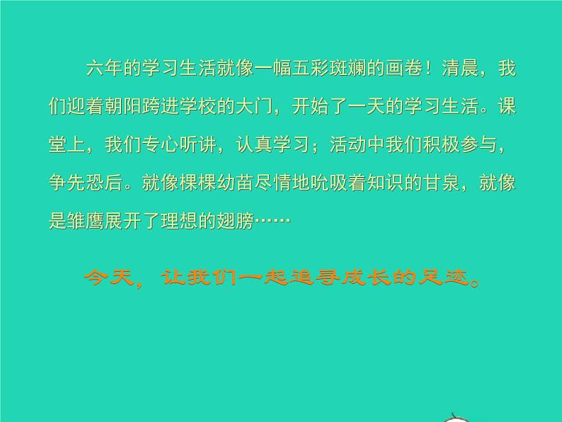 六年的学习生活就像一幅五彩斑斓的画卷!清晨,我们迎着朝阳跨进学校的大门,开始了一天的学习生活。课堂上,我们专心听讲,认真学习;活动中我们积极参与,争先恐后。就像棵棵幼苗尽情地吮吸着知识的甘泉,就像是雏鹰展开了理想的翅膀……