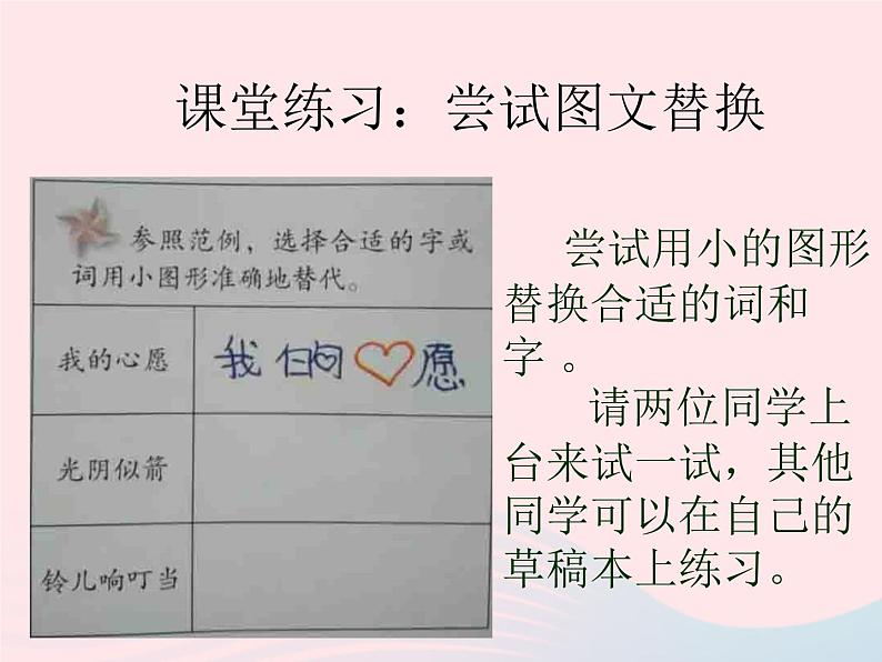 尝试用小的图形替换合适的词和字 。 请两位同学上台来试一试,其他同学可以在自己的草稿本上练习。