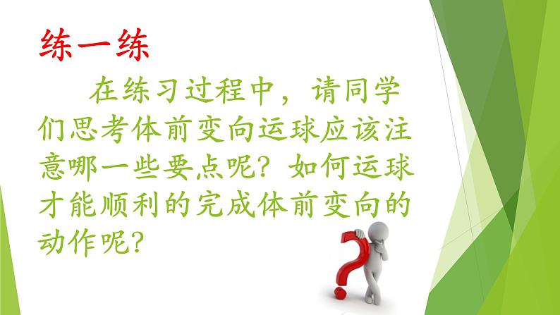 在练习过程中,请同学们思考体前变向运球应该注意哪一些要点呢?如何运球才能顺利的完成体前变向的动作呢?