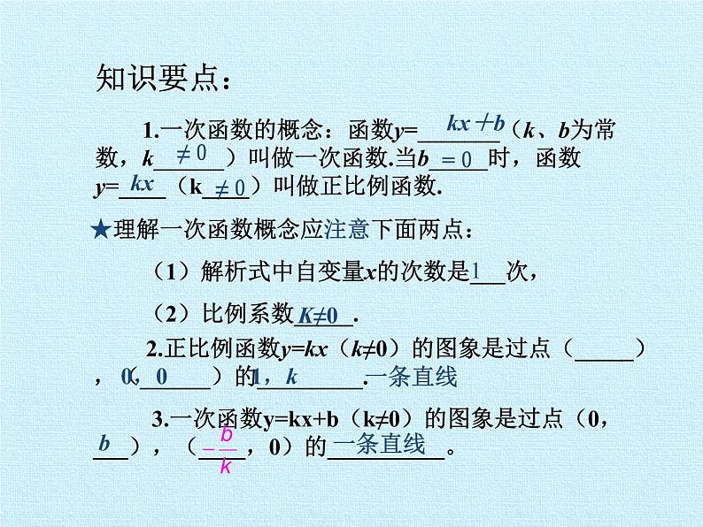 展开1.一次函数的概念:函数y=_______(k、b为常数,k______)叫做一次函数.当b_____时,函数y=____(k____)叫做正比例函数.