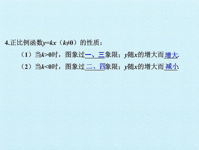 4.正比例函数y=kx(k≠0)的性质: (1)当k>0时,图象过______象限;y随x的增大而____. (2)当k<0时,图象过______象限;y随x的增大而____.