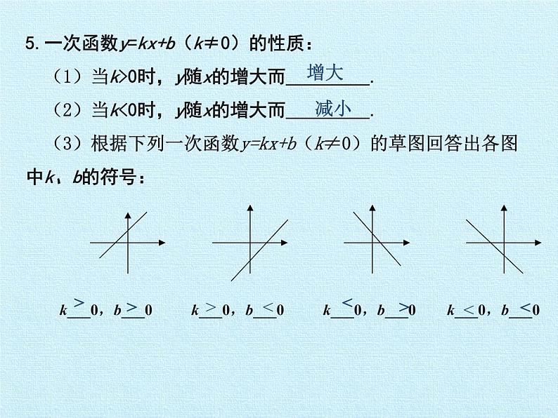 5.一次函数y=kx+b(k≠0)的性质: (1)当k>0时,y随x的增大而_________. (2)当k<0时,y随x的增大而_________. (3)根据下列一次函数y=kx+b(k≠0)的草图回答出各图中k、b的符号:
